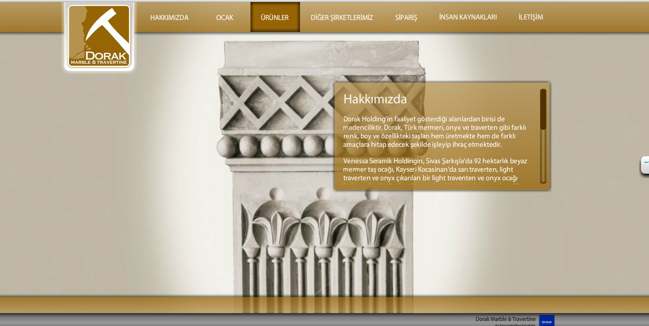 Dorak Holding, faaliyet gösterdiği alanlardan birisi olan madencilik ile Türk mermeri, onyx ve traverten gibi farklı renk, boy ve özellikteki taşları hem üretmekte hem de farklı amaçlara hitap edecek şekilde işleyip ihraç etmektedir. Her zaman olduğu gibi Web tasarım konusunda İda Consulting farkını tercih eden Dorak Holding’e teşekkürlerimizi sunarız. Web site çalışmaları hızla devam etmek olup, çok kısa sürede yayına alınacaktır.